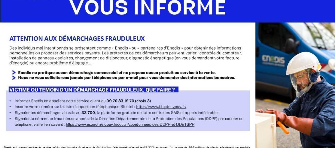 Il semble que certains administrés sont démarchés par des personnes se présentant comme prestataires d’ENEDIS afin de réaliser des contrôles sur les coffrets pour cause de surtension électrique sur la … Lire la suite de Attention au démarchage frauduleux