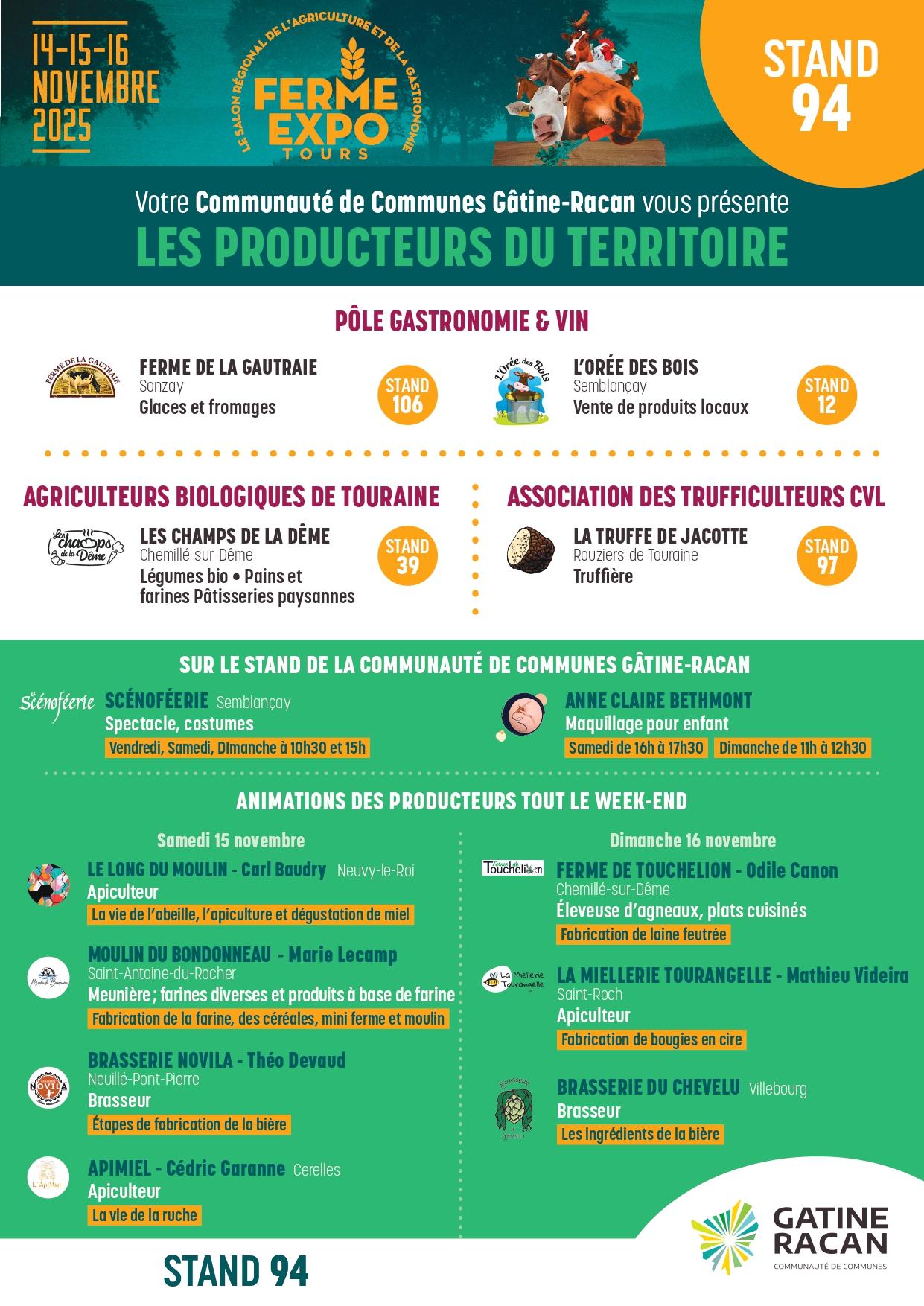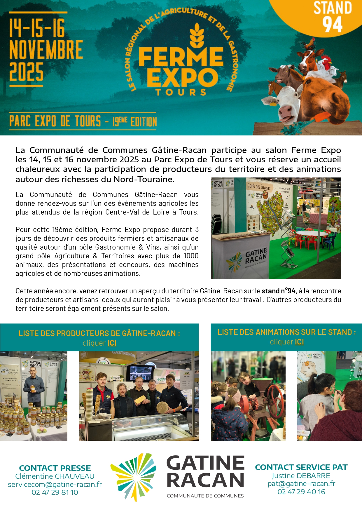 La communauté de communes Gâtine-Racan tient le stand n°94 à la Ferme Expo qui aura lieu du 14 au 16 novembre 2025 !