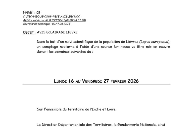 AVIS ÉCLAIRAGE LIÈVRE Dans le but d’un suivi scientifique de la population de Lièvres (Lepus europaeus), un comptage nocturne à l’aide d’une source lumineuse va être mis en œuvre durant …