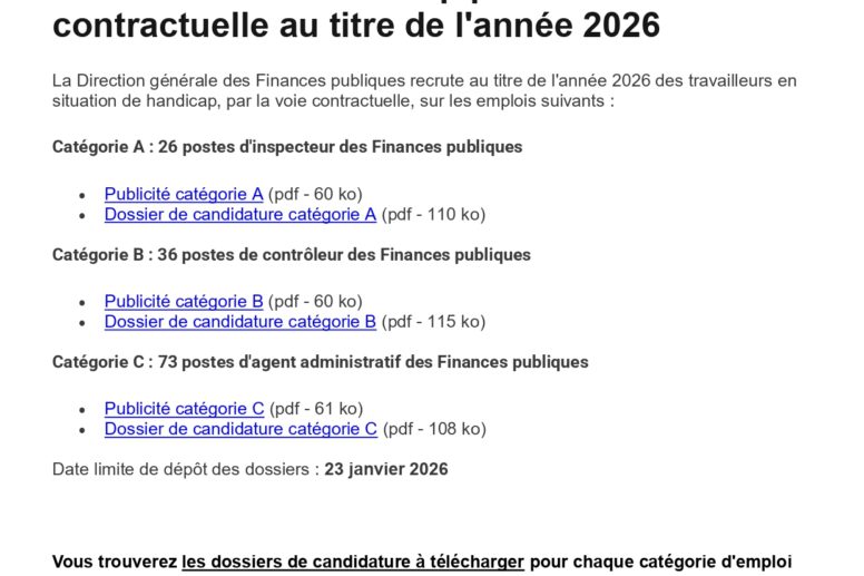 La DGFIP recrute DGFiP – Avis de recrutement de travailleurs en situation de handicap par la voie contractuelle au titre de l’année 2026 La Direction générale des Finances publiques recrute …